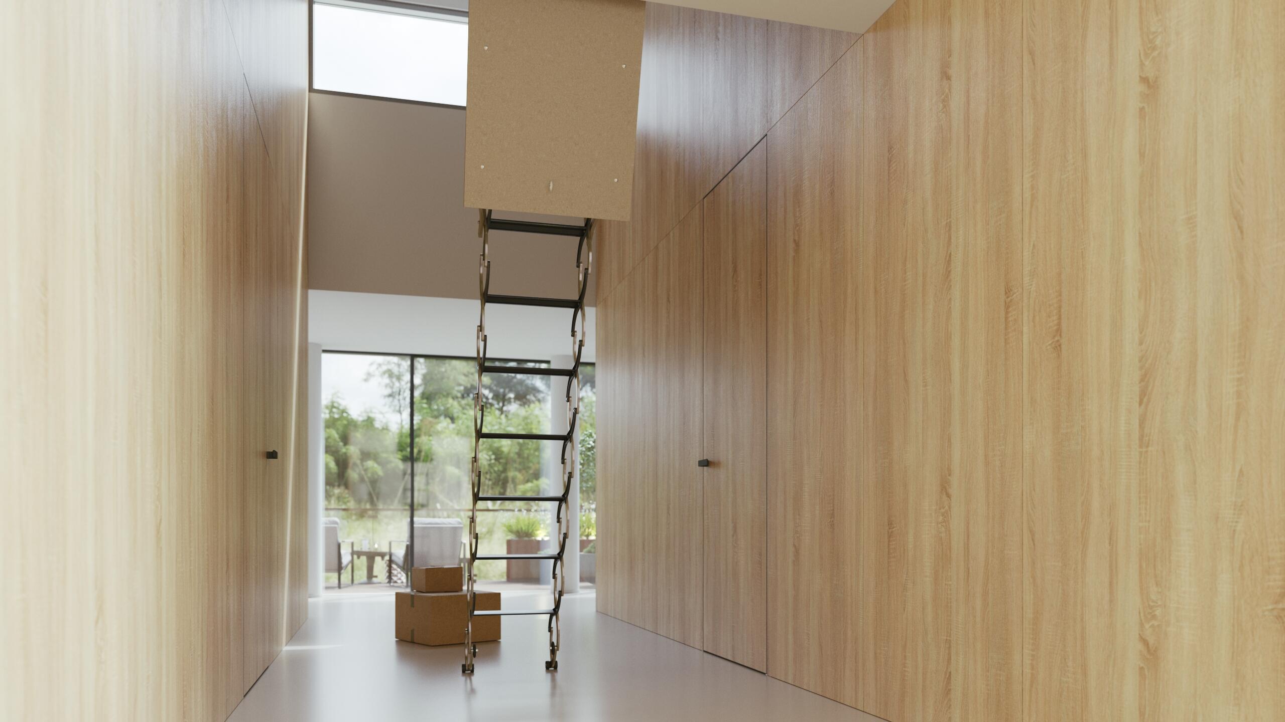 | V niektorých interiéroch je nutné umiestniť sťahovacie schody do steny. JAP ponúka riešenie v podobe podkrovných schodov s názvom Verticale |
