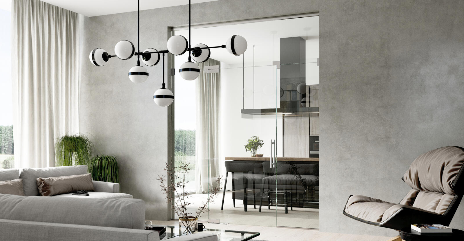 Zostava Éta sa skladá z hornej kotviacej lišty, 2× príchytky do steny pre dve sklá, horného pántu s protikusom, rohovej spojky s dorazom, držadla, dverného zatvárača a dolného U-profilu. Držadlá je možné nahradiť za kľučku.