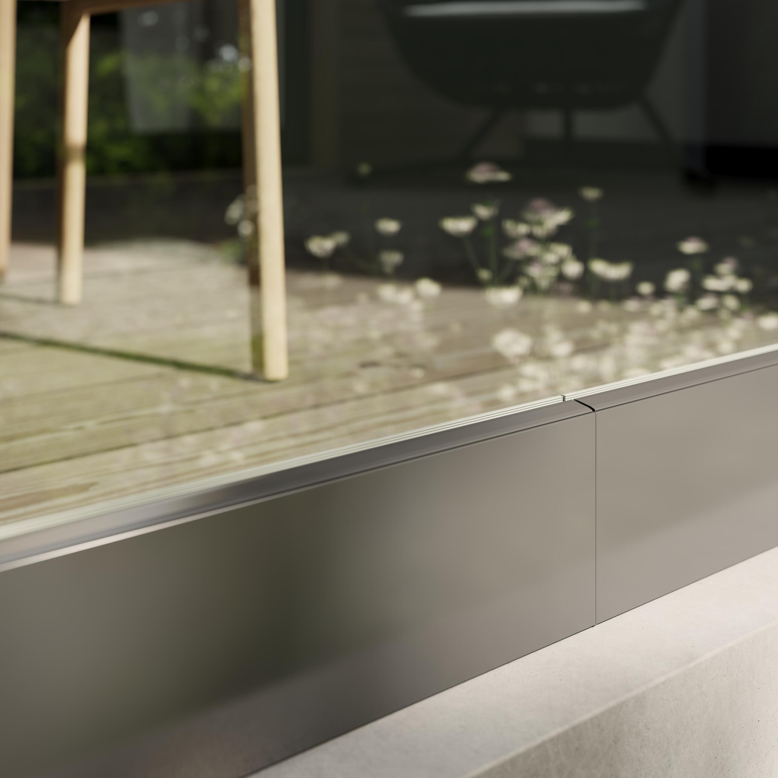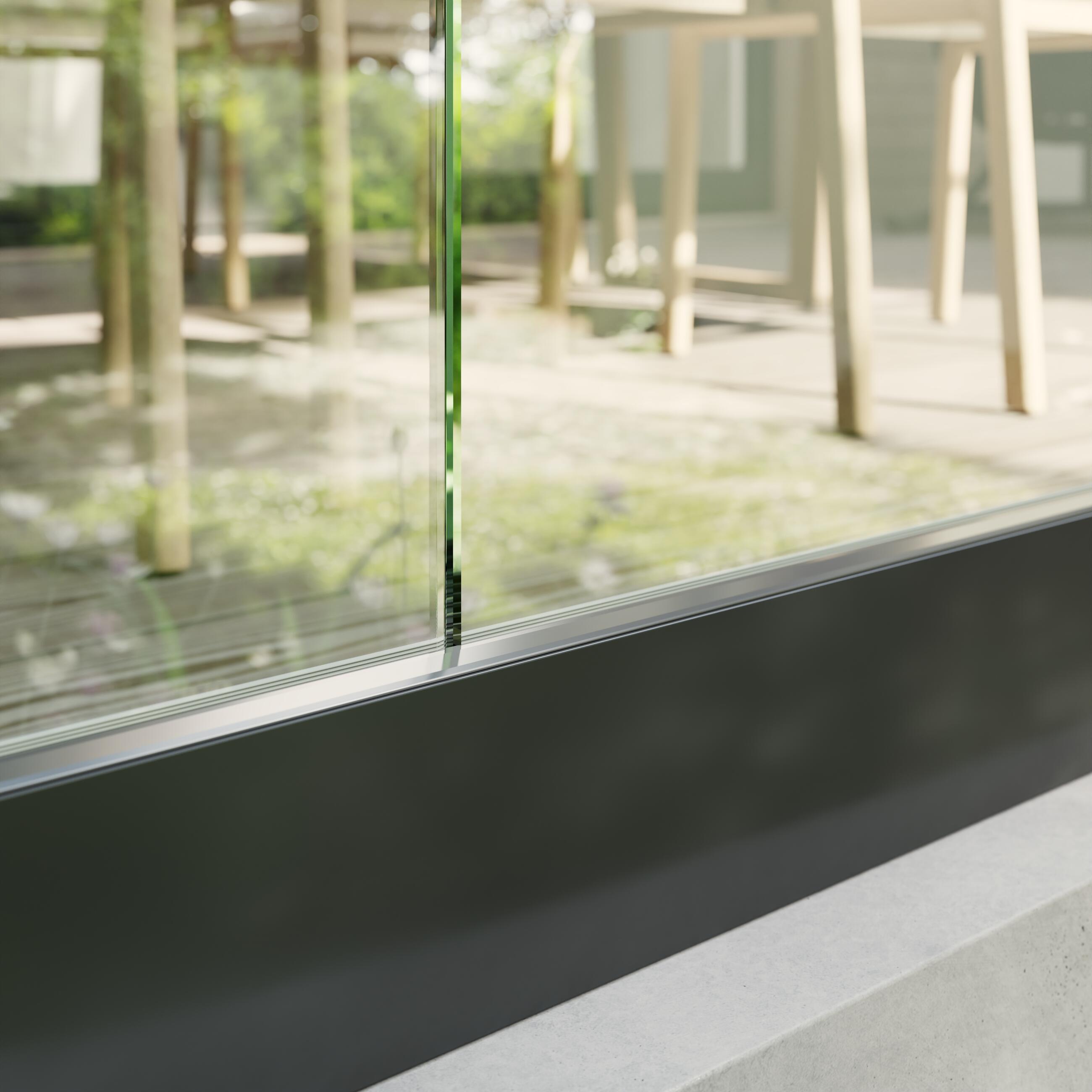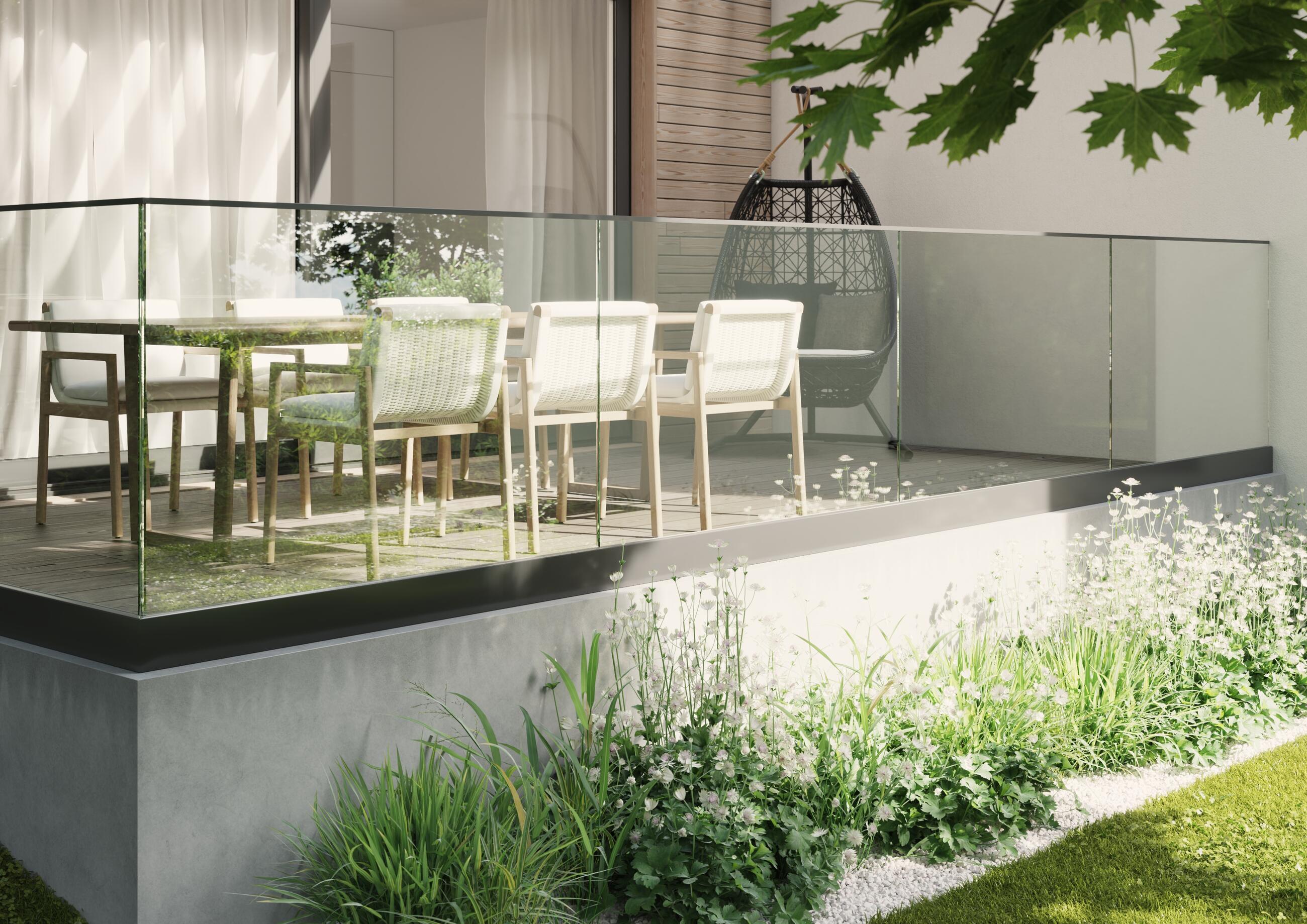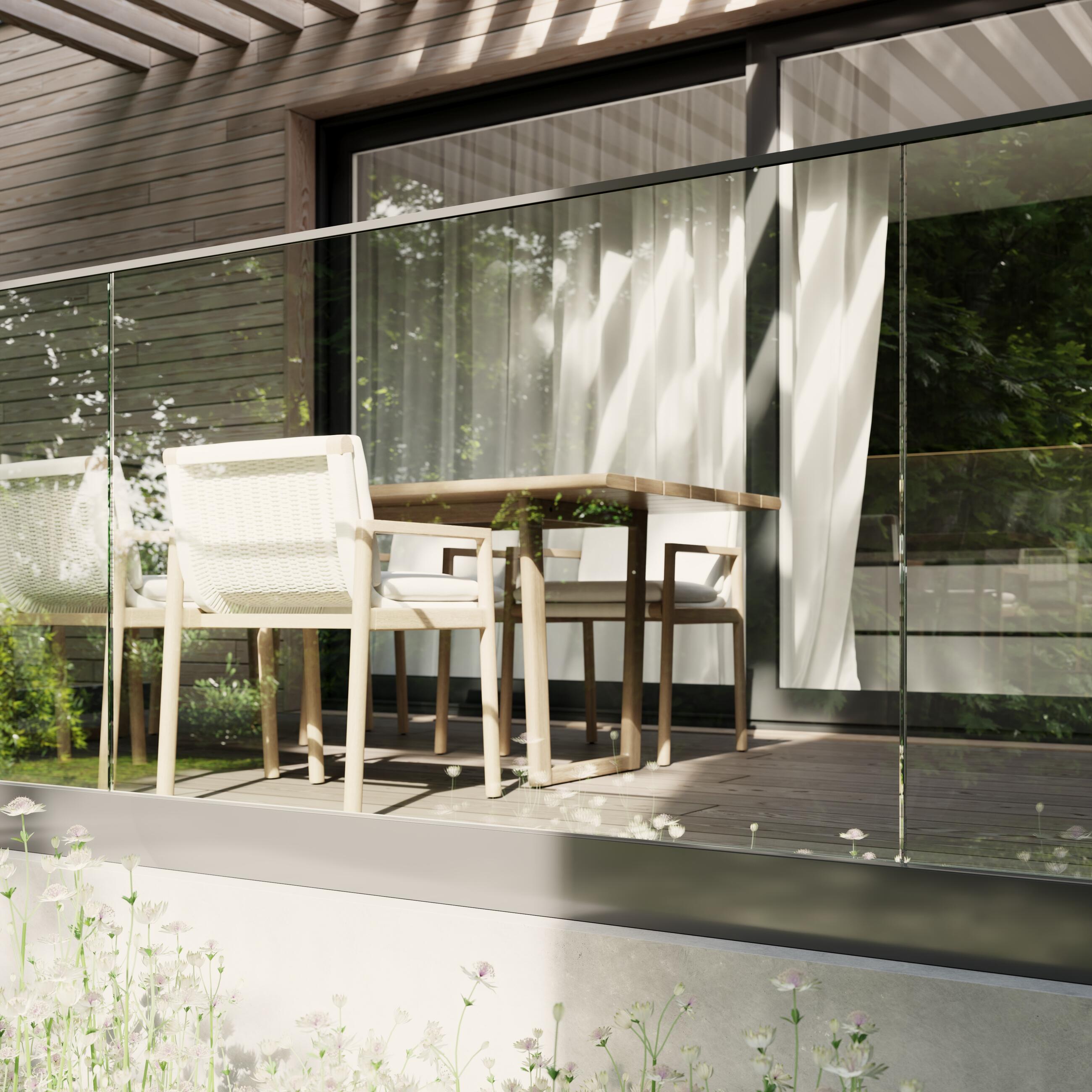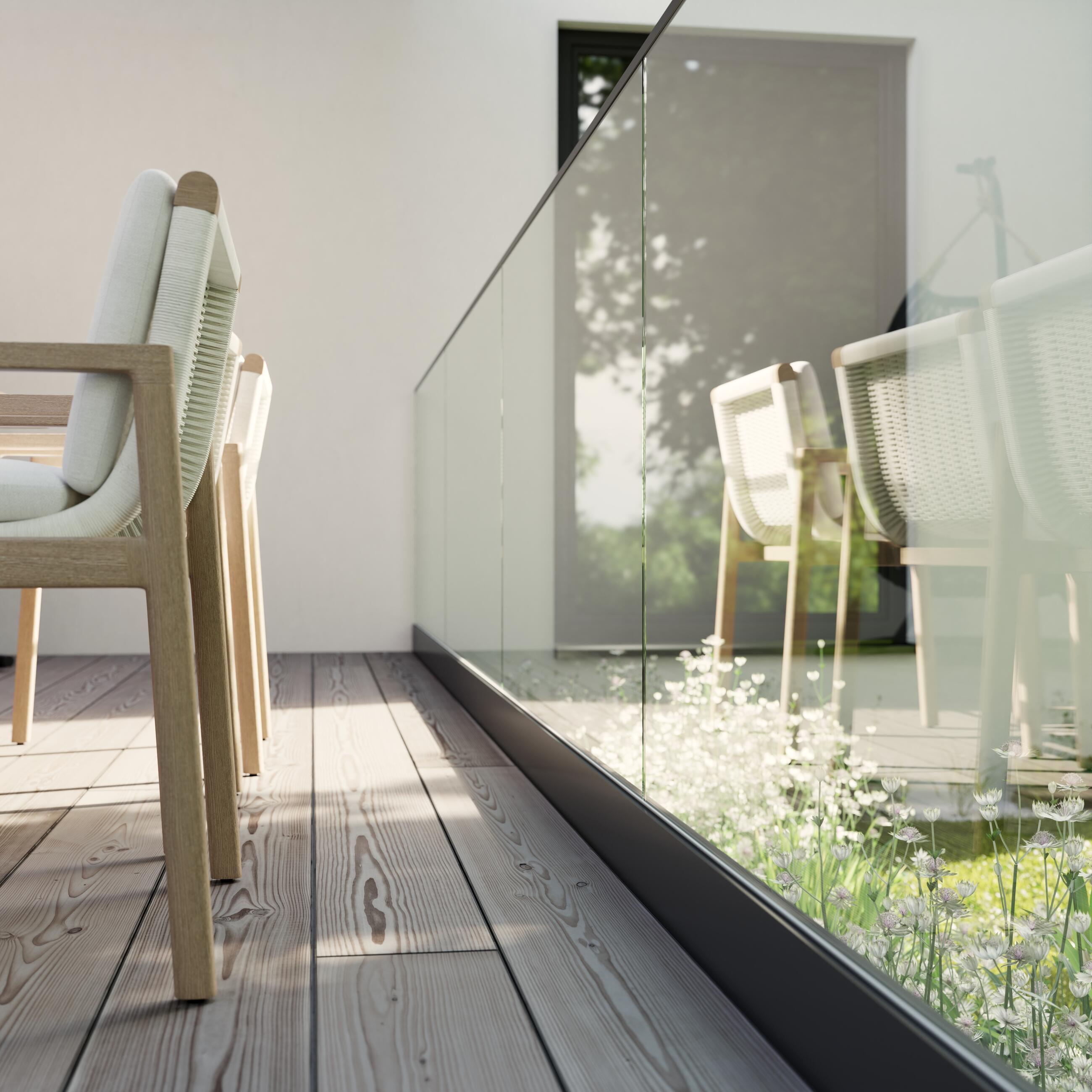 - Výhodou tohto zábradlia je možnosť „utopenia“ lišty do skladby podlahy s vystupujúcim sklom nad nášľapnou plochou