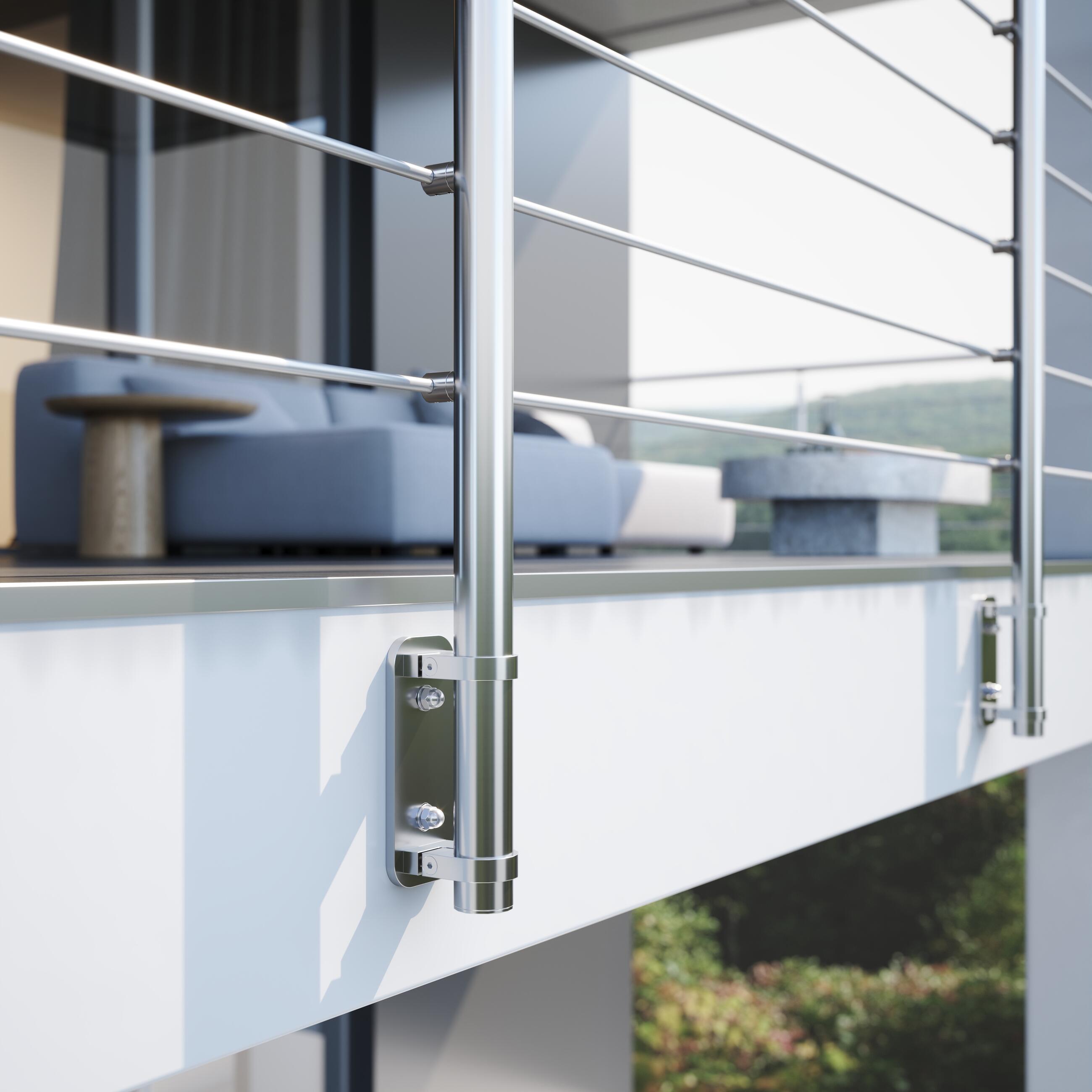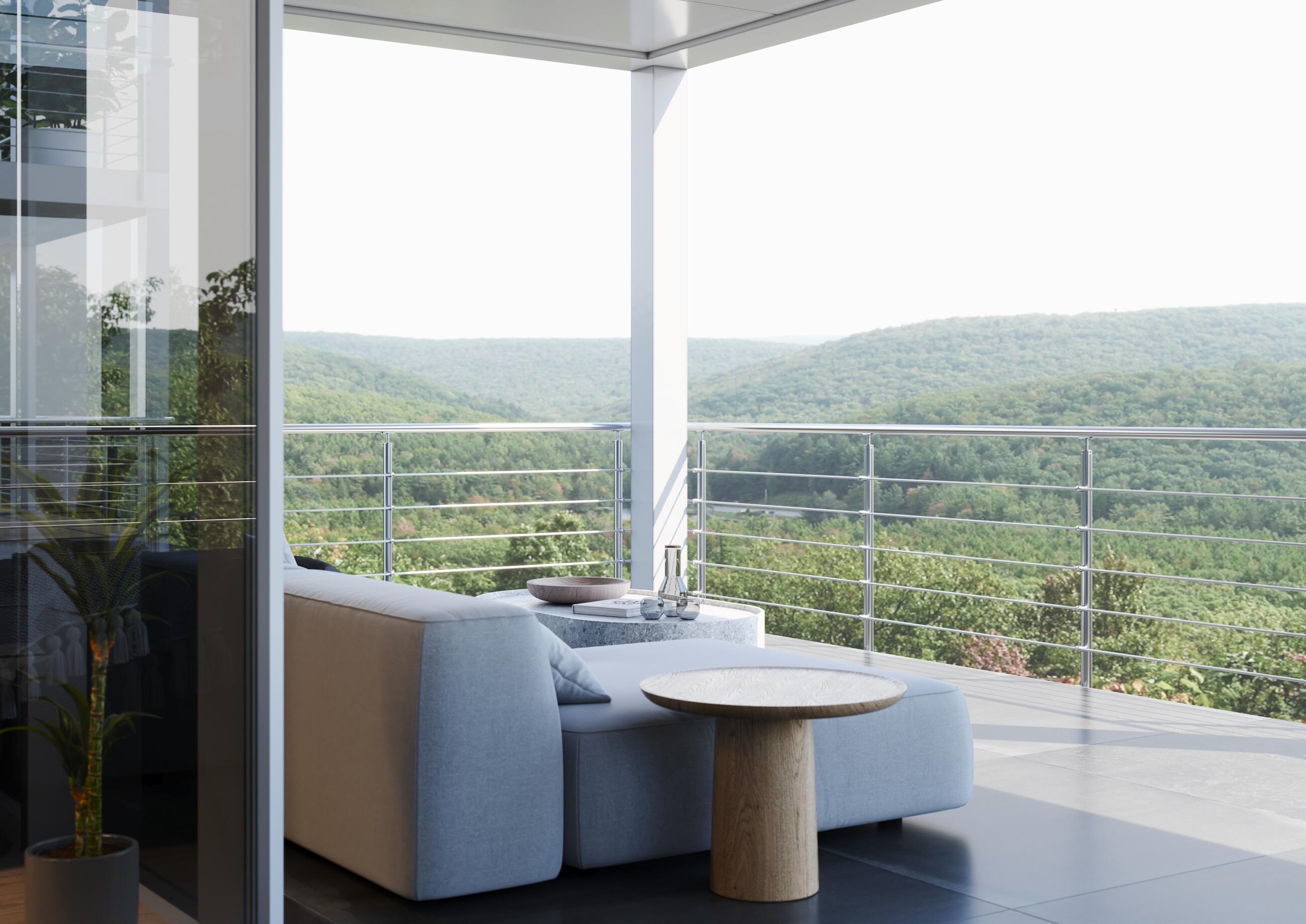 Zábradlie TERASA 2 má základnú konštrukciu tvorenú stĺpikmi, vodorovnou prútovou výplňou a madlem z antikorovej ocele. Antikorové pätky sa kotvia z bočnej strany