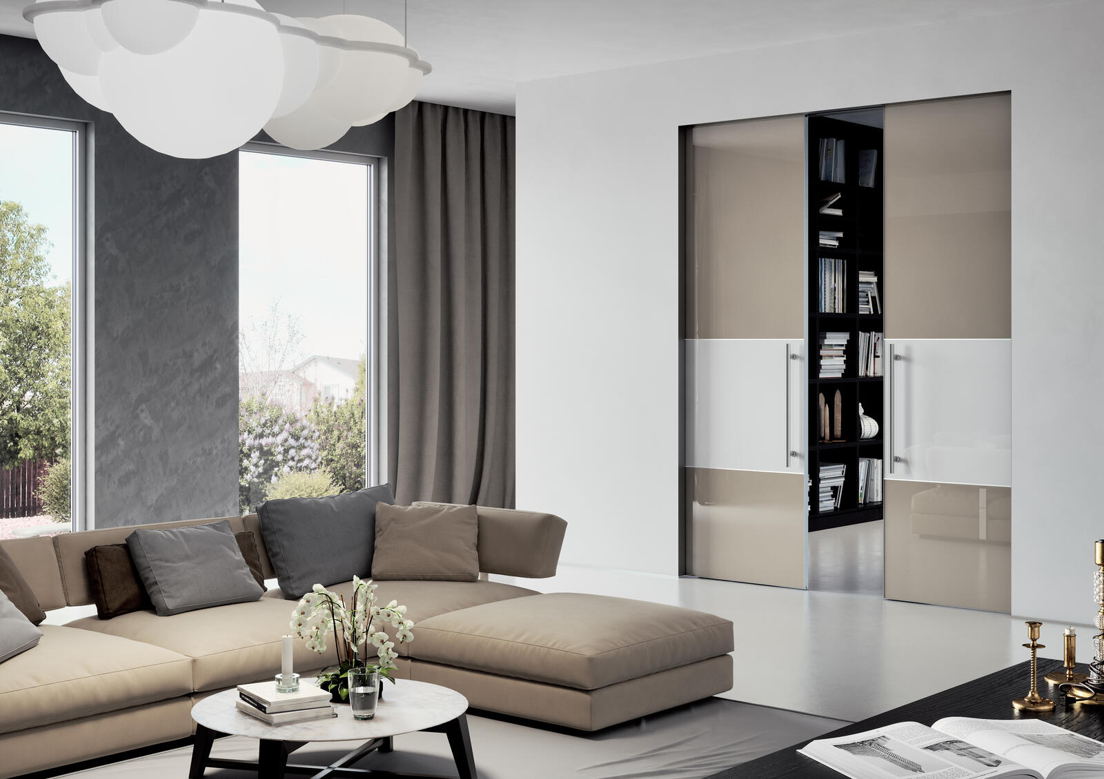 Bezobložkové stavebné puzdro pre dvojkrídlovézasúvacie dvere. Dizajnový model, ktorý je ideálny pre minimalisticky riešené interiéry. Puzdro je prispôsobené tak, aby jeho skrytá konštrukcia vytvorila hranu prechodového otvoru a v prípade požiadavky investora mohla byť skrytá pod povrchovou dokončovacou úpravu priečky. Pohyb drevených dverných krídel je v prípade tohto typu stavebného puzdra synchronizovaný – synchrónny posuv je v cene. Balíček synchron neposkytujeme ku skleneným dverným krídlam. V prípade murovanej priečky musí mať stavebný otvor preklad – stavebné puzdro nie je schopné niesť zaťaženie.