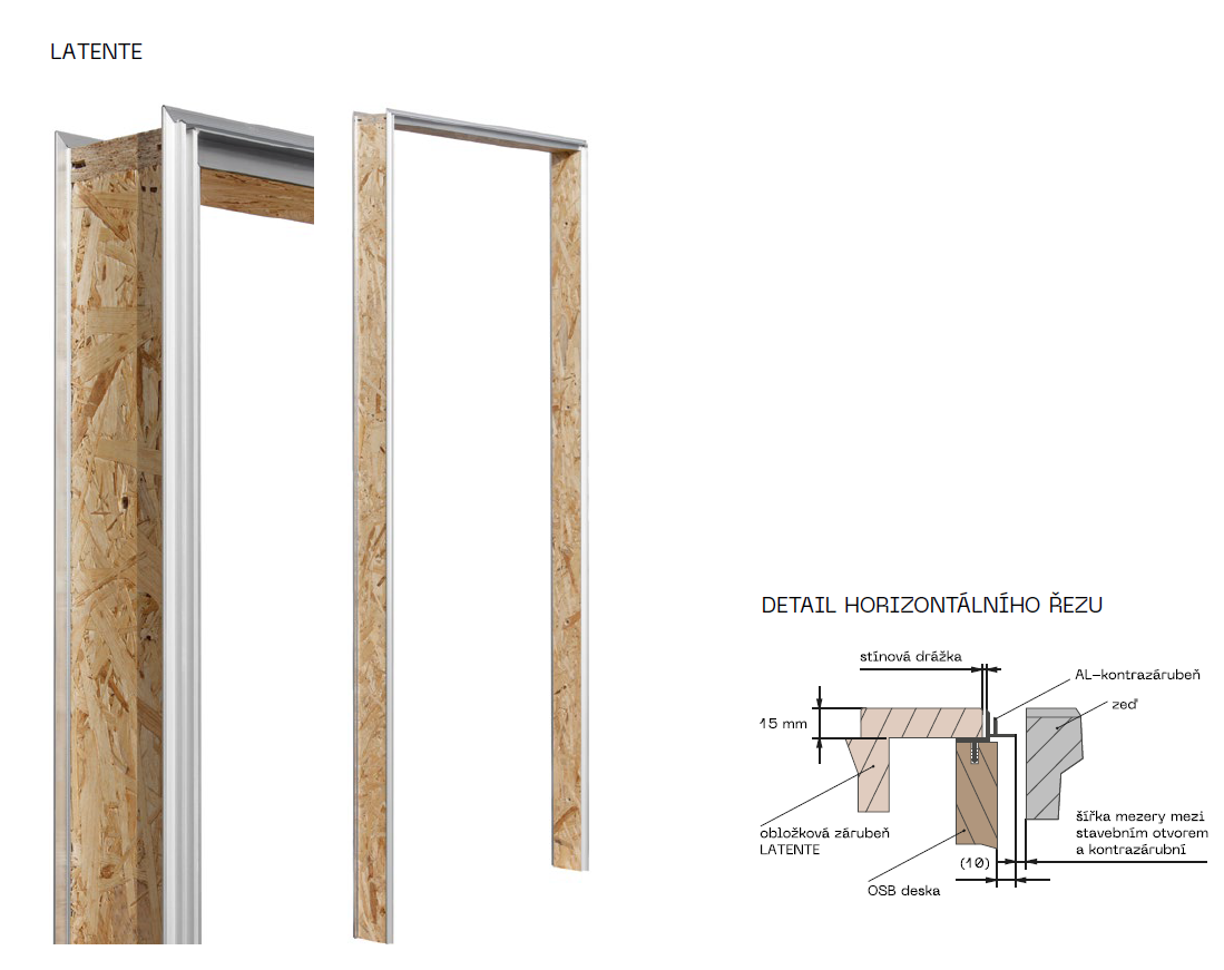 Sme výrobcami takzvanej kontrazárubne. Ide o zárubňu, ktorá umožní zapustenie drevenej obložky do úrovne steny. Drevenú obložku dodáva výrobca dverí. Priechod okolo dverí je ohraničený zárubňou, ktorá je v jednej rovine so stenou. Kontrazárubňa je vyrobená z OSB dosky hrúbky 22 mm a surového hliníkového profilu. Zárubňa Latente slúži na otváranie dverí z pohľadovej lícujúcej strany smerom k sebe aj od seba.