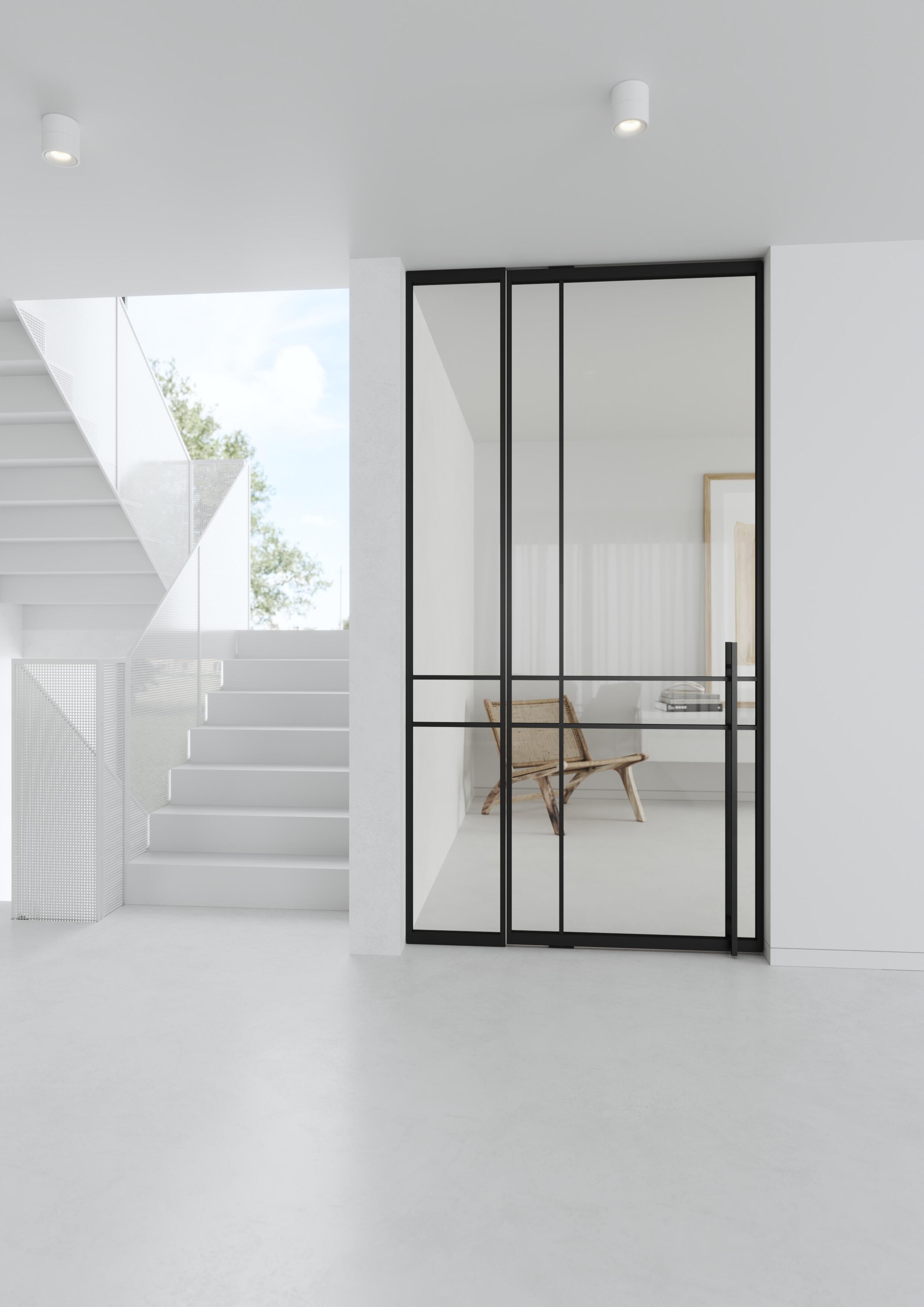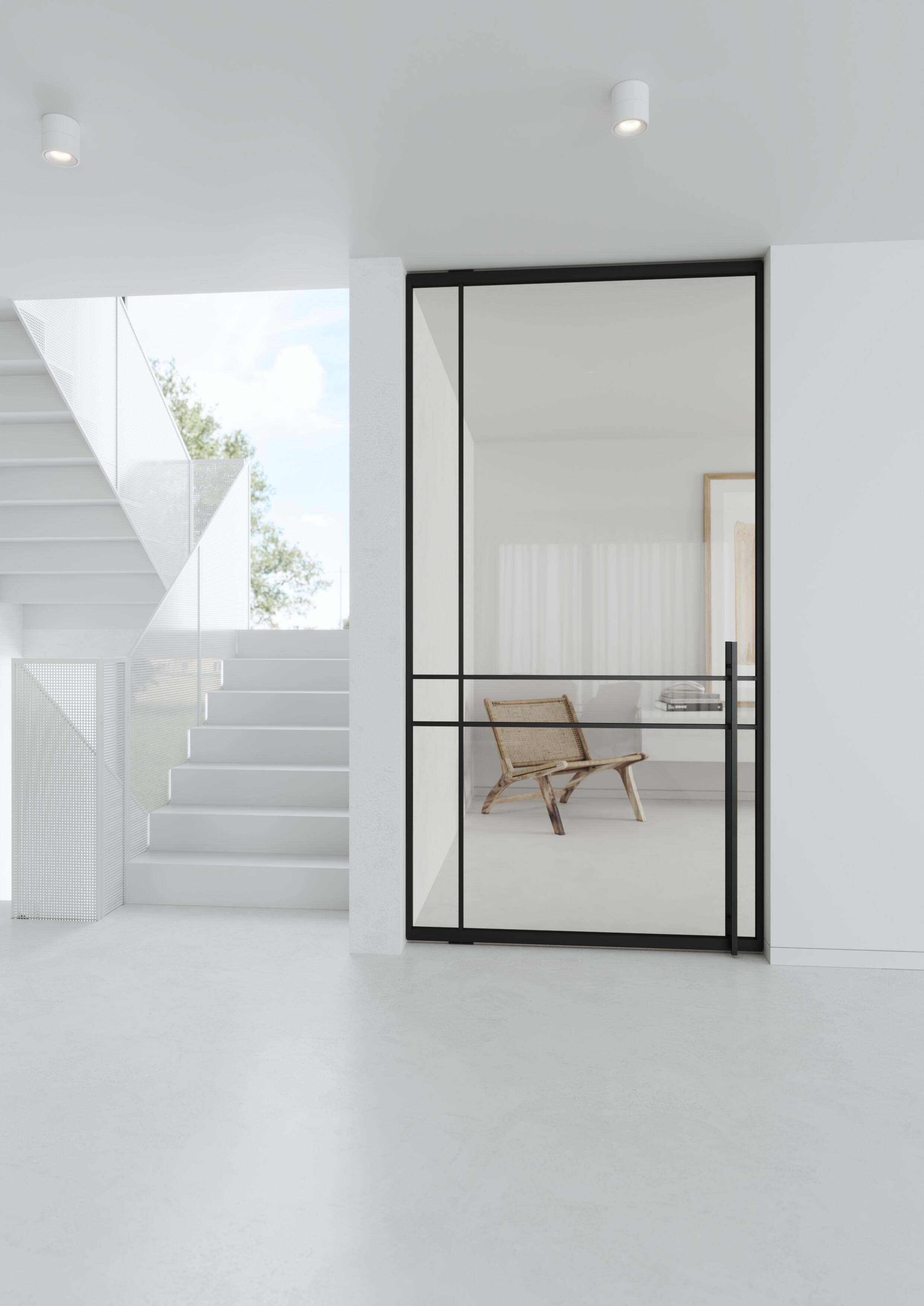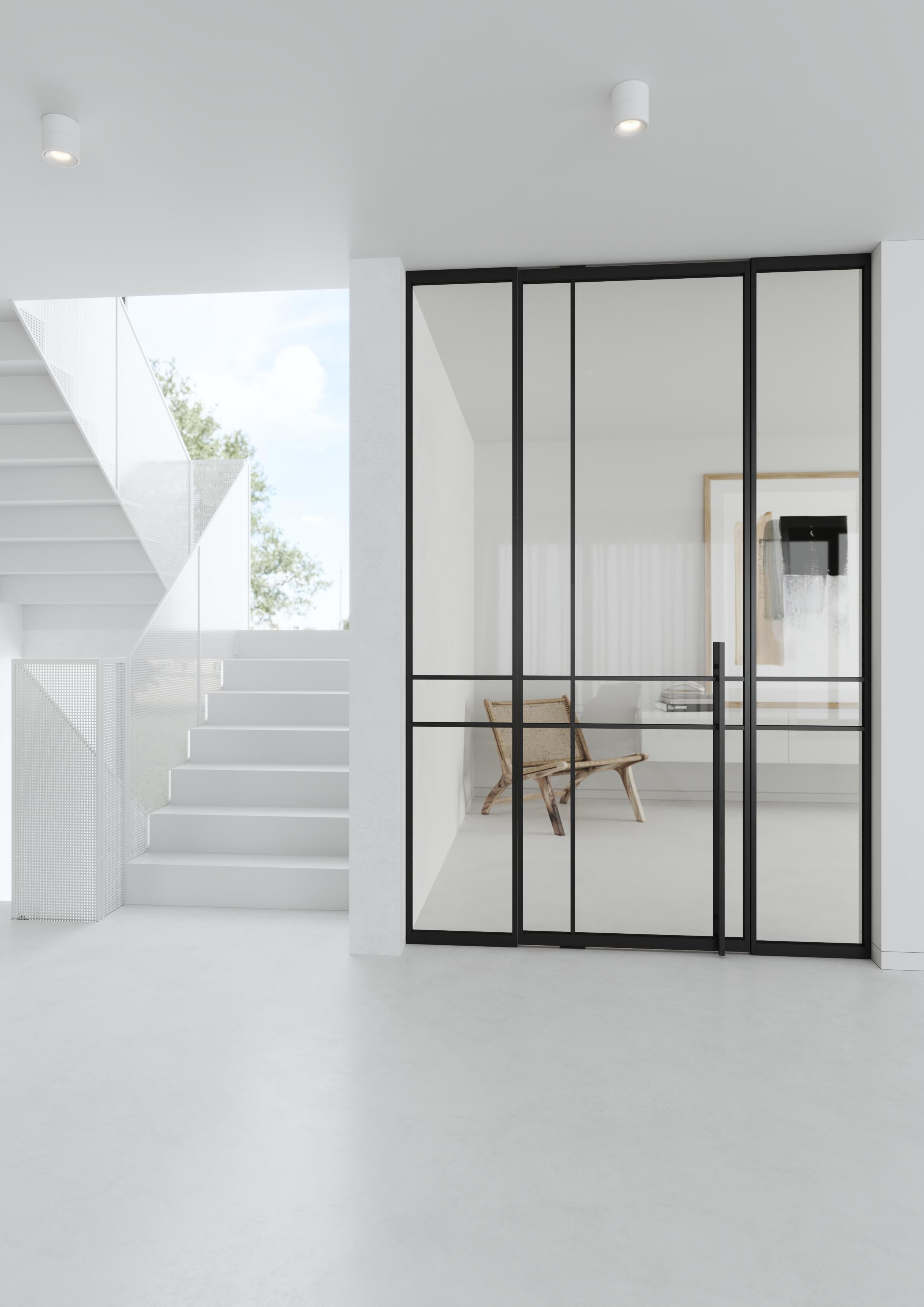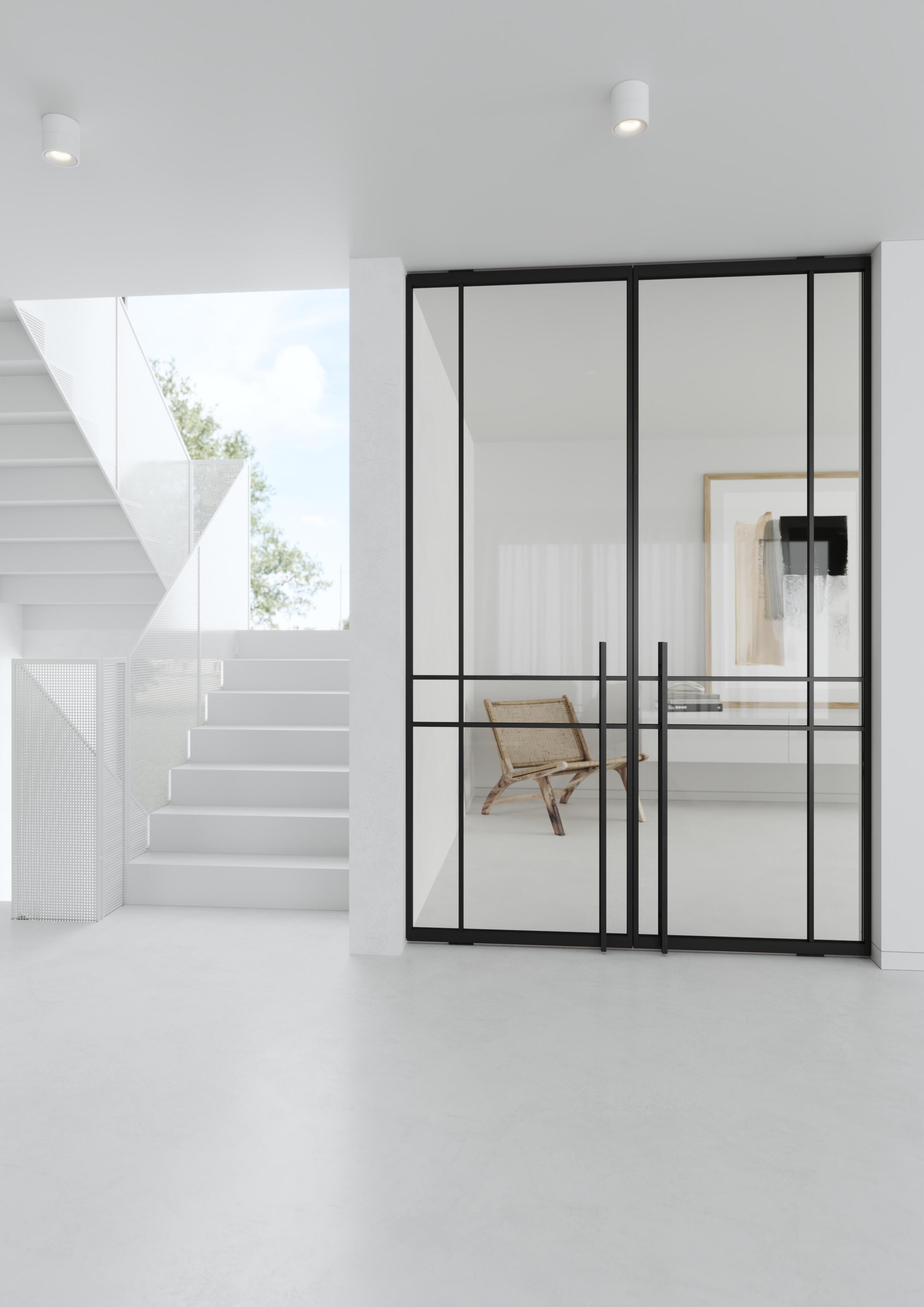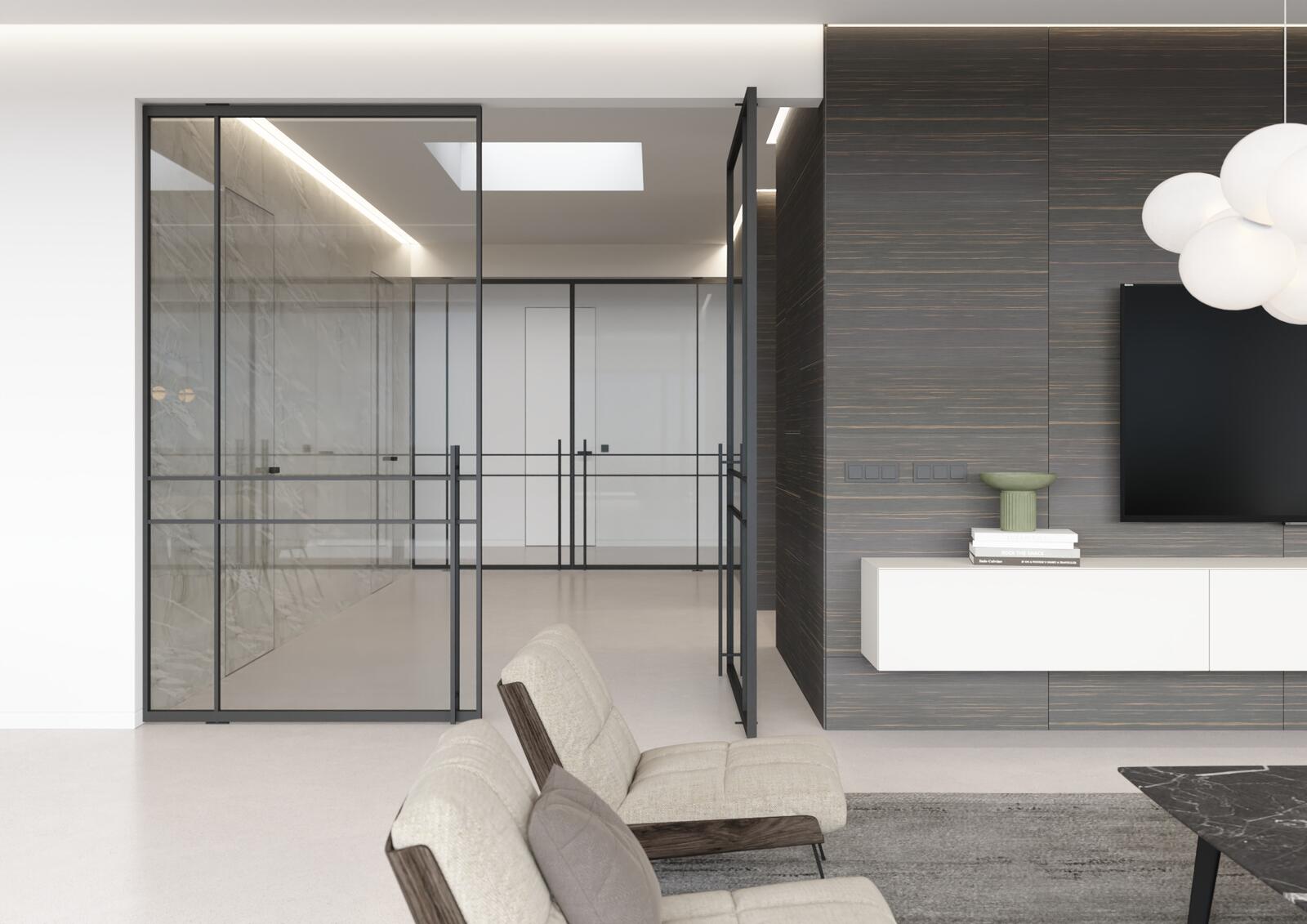 Dojem odľahčenosti dodáva dverám hliníkový rám a vnútorné kalené sklo, ktoré môže byť číre, mliečne alebo dymové.