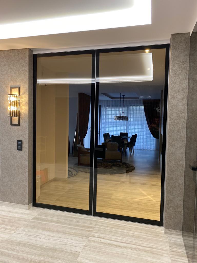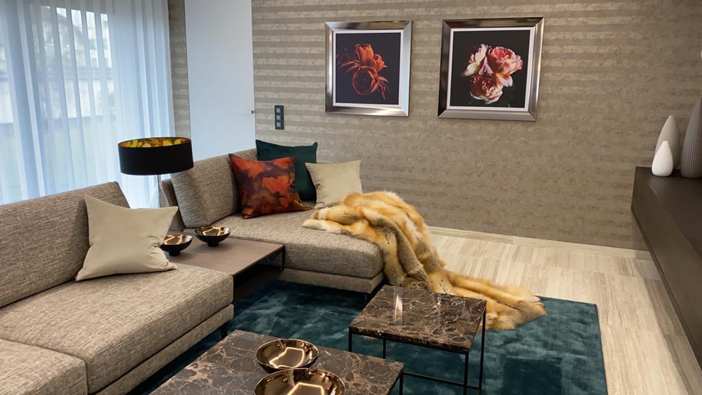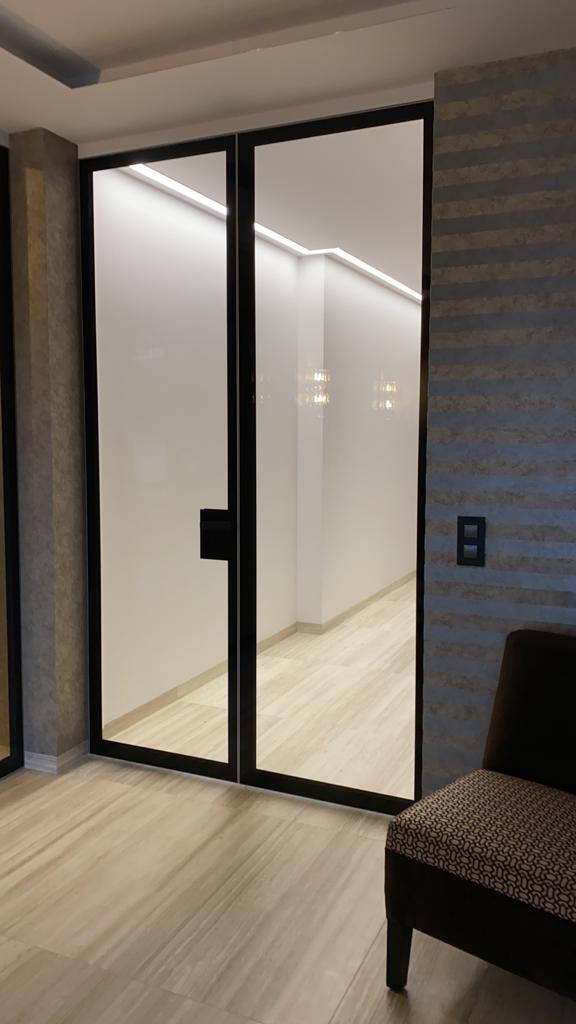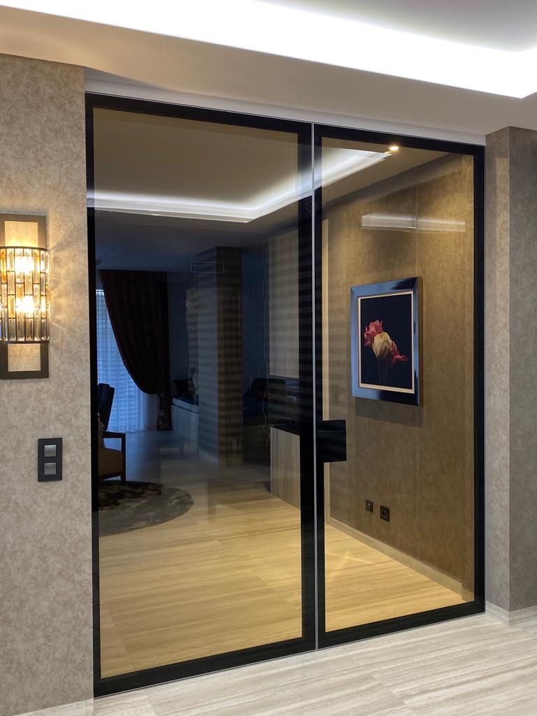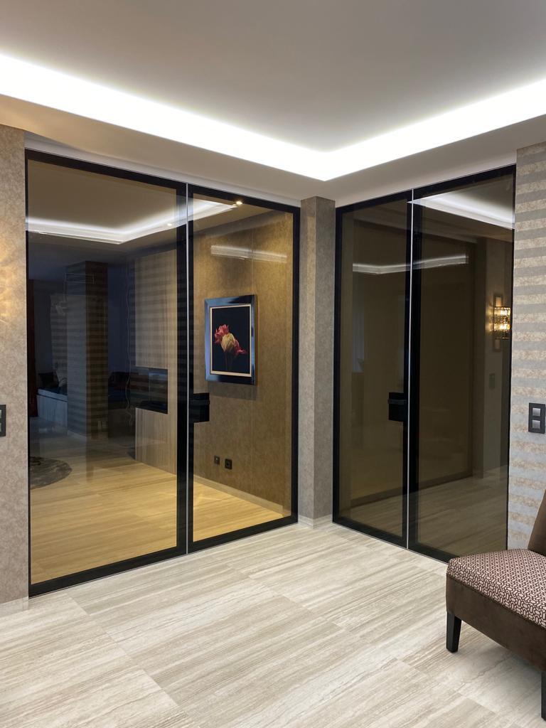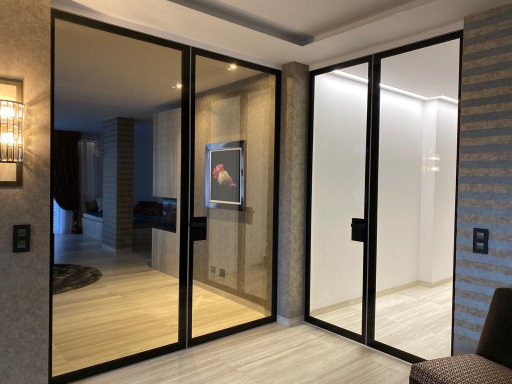 „Interiér haly rodinnej vily – tento typ dverí bol zvolený pre ľahkosť a svetlo, bolo potrebné oddeliť súkromnú časť od spoločenskej časti domu, ale nie úplne ju uzavrieť. V rovnakom príspevku použitá zárubňa a dvere Aktive pod sklenenou tapetou zn. Texam skryto neskryté dvere do pánskej pracovne. Historicky sa tento typ používa od čias Ľudovíta X-tého na všetkých zámkoch až dodnes a má to svoje čaro a mnoho skrytých príbehov.“