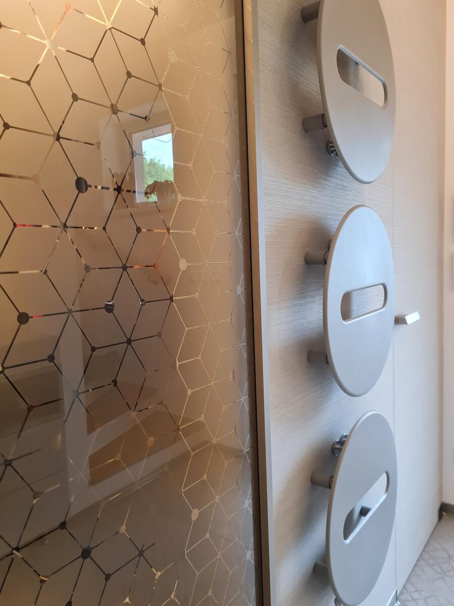 - zvýrazniť a zjednodušiť prechod k šatníku cez posuvné sklenené dvere, aby cez ne do šatníka bolo aj nebolo vidieť a aby neprekážali v priestore a nemuseli sa obchádzať...