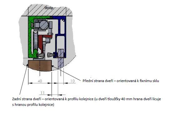 - zadná strana dverí – orientovaná k profilu koľajnice (pri dverách hrúbky 40 mm hrana dverí lícuje s hranou profilu koľajnice)