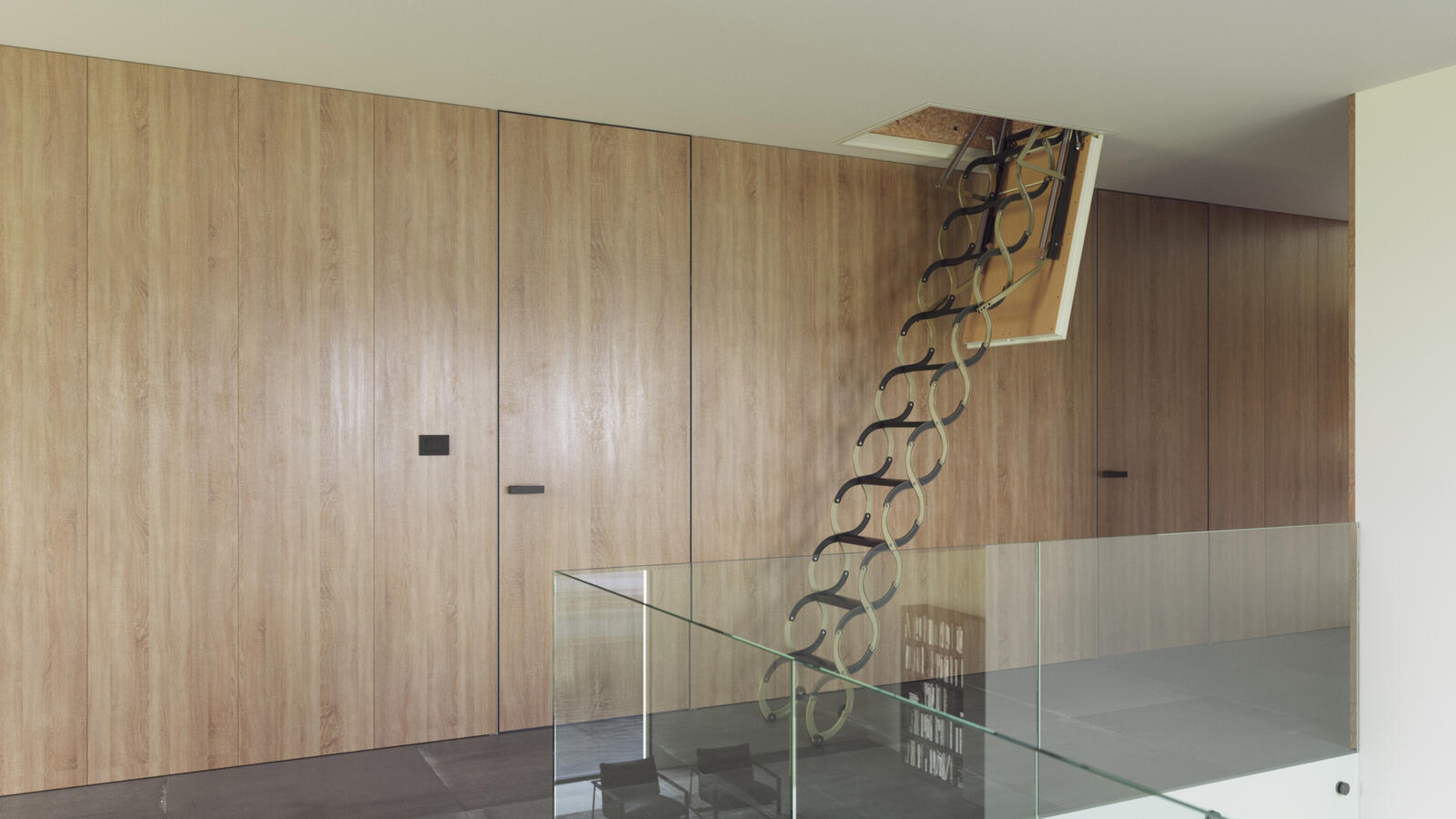 Schody s plechovým sendvičovým vekom zabudované do stropu. Vnútri veka je tepelná a protipožiarna izolácia. Škára medzi vekom a rámom je tesnená protipožiarnou speňovacou páskou. Na konštrukciu rámu je upevnený harmonikový rebrík spojený s vekom. Celý priestor schodov je zhora uzatvorený zatepleným vekom. Dolné veko je z pohľadovej časti vybavené bielou farbou a kryté ochrannou fóliou, drevené časti horného veka sú ošetrené fungicídnym roztokom a použitá preglejka je vodoodolná.
