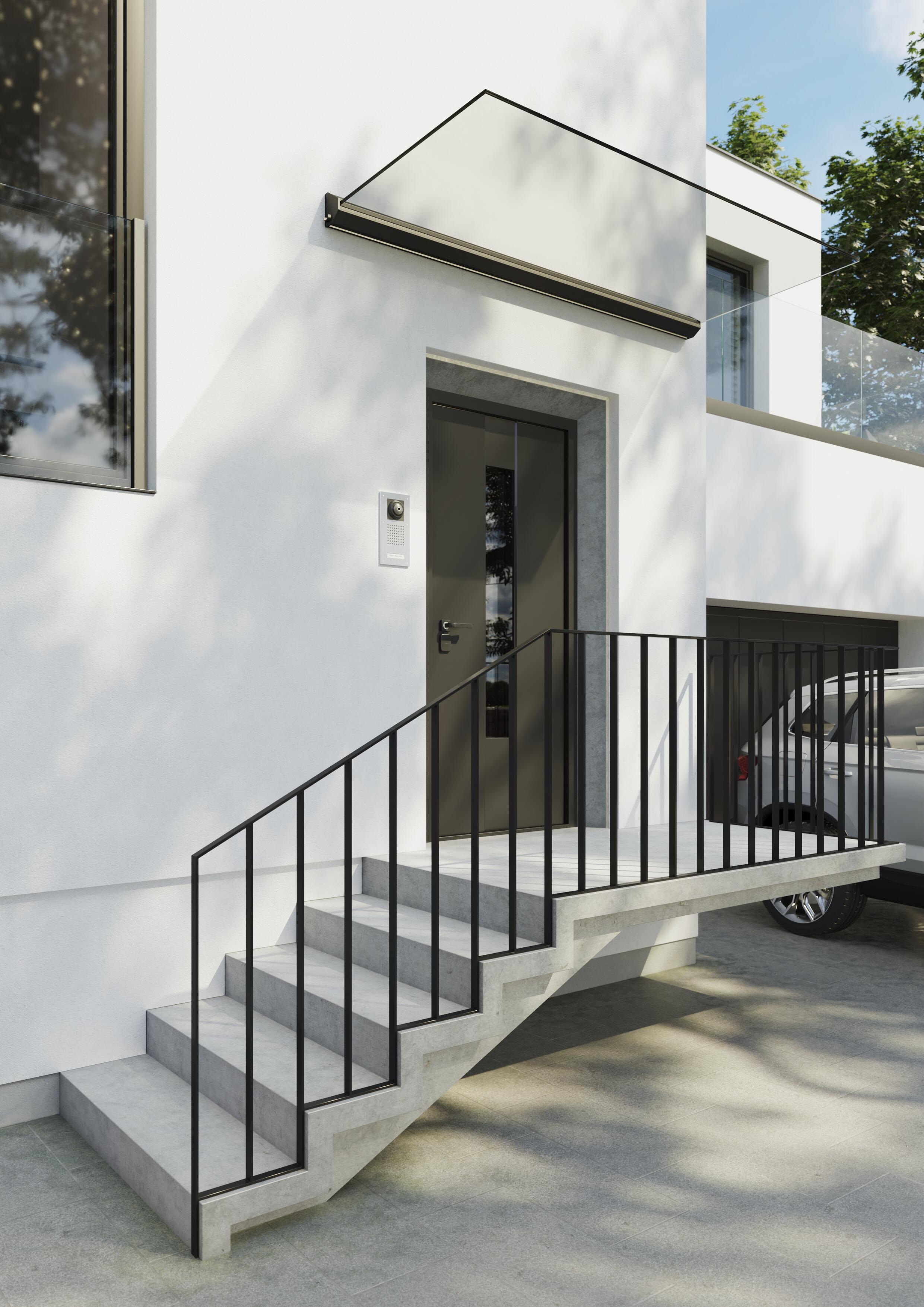 Sklenená vchodová strieška Cool. Skladá sa z masívneho hliníkového profilu do ktorého sa vďaka spádu sklenenej dosky zvádza zachytená dažďová voda, zaslepenia kraja profilu s výpustmi vody a z už spomínaného skla ktoré je špeciálne kalené sklo Connex. Strieška spĺňa normu pre nosnosť snehu podľa danej lokality v Českej republike (s maximálnym vyložením skla 1100 mm).