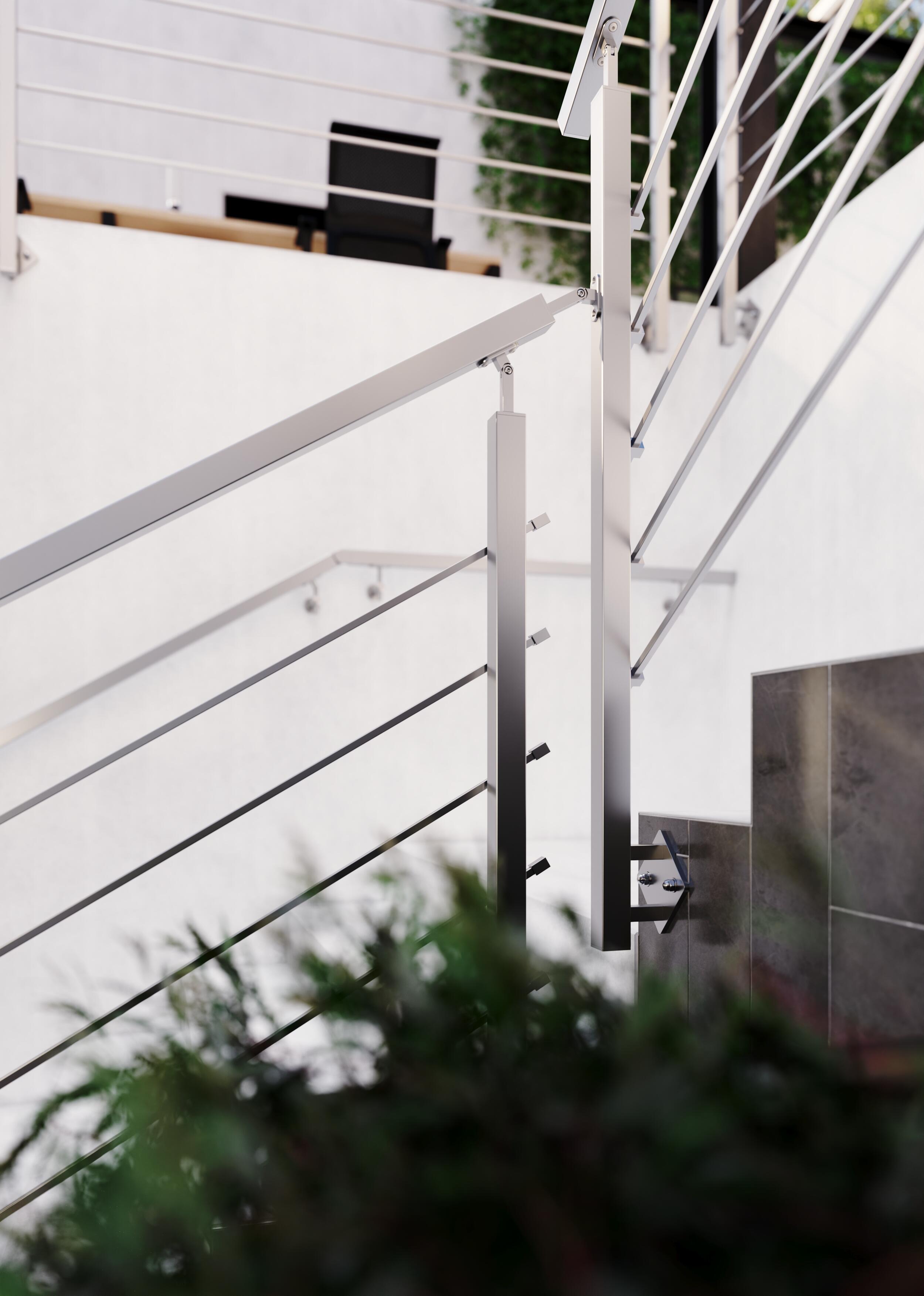 Exteriérové/interiérové zábradlie USE má základnú konštrukciu pozostávajúcu z hranatých stĺpikov, hranatej vodorovnej prútovej výplne a držadla z nehrdzavejúcej ocele. Drevené držadlo môže byť len v interiéri, do exteriéru drevené držadlá nedávame. Antikorové pätky sa kotvia z bočnej strany schodiska. Stĺpiky a držadlo modelu USE vyrábame aj vo farebných odtieňoch podľa požiadaviek zákazníka, prúty zostávajú z nehrdzavejúcej ocele.